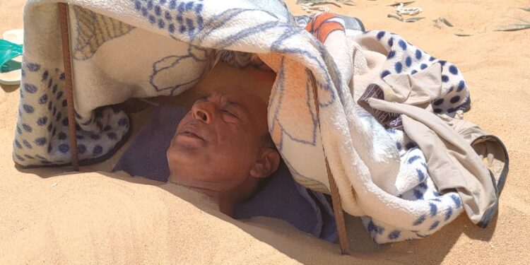 ويُدفن المرضى حتى أعناقهم في تلك الرمال لمدة 15 دقيقة يومياً على مدى ثلاثة أيام. بعد ذلك يُنقل المرضى من الرمل إلى خيام تغلق تماماً لتكون بمثابة “ساونا” طبيعية.